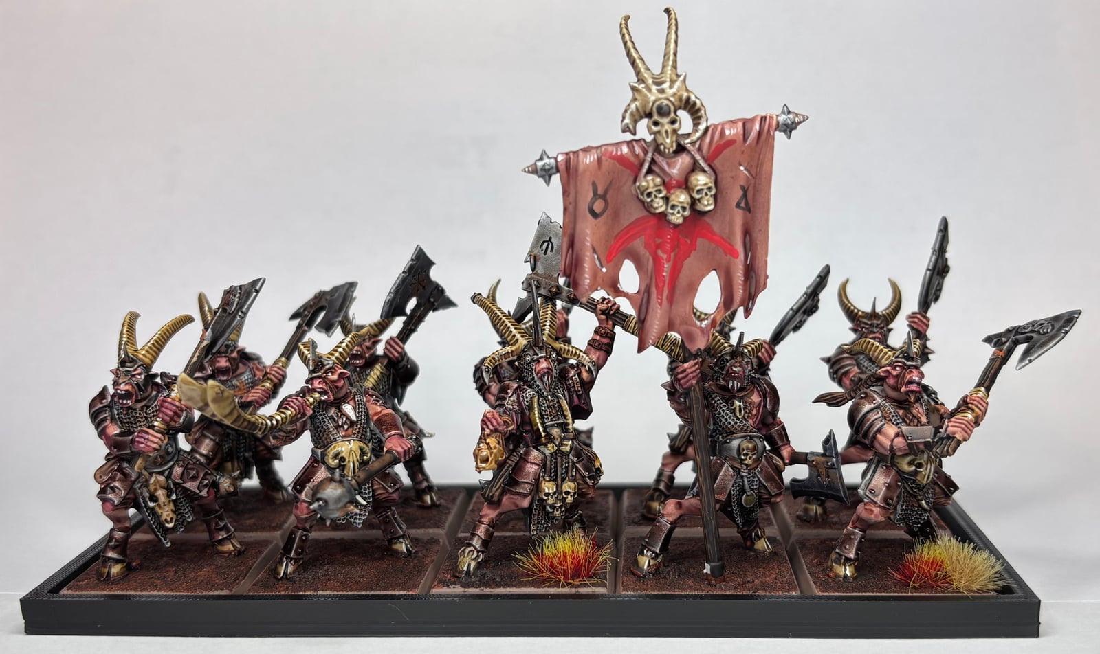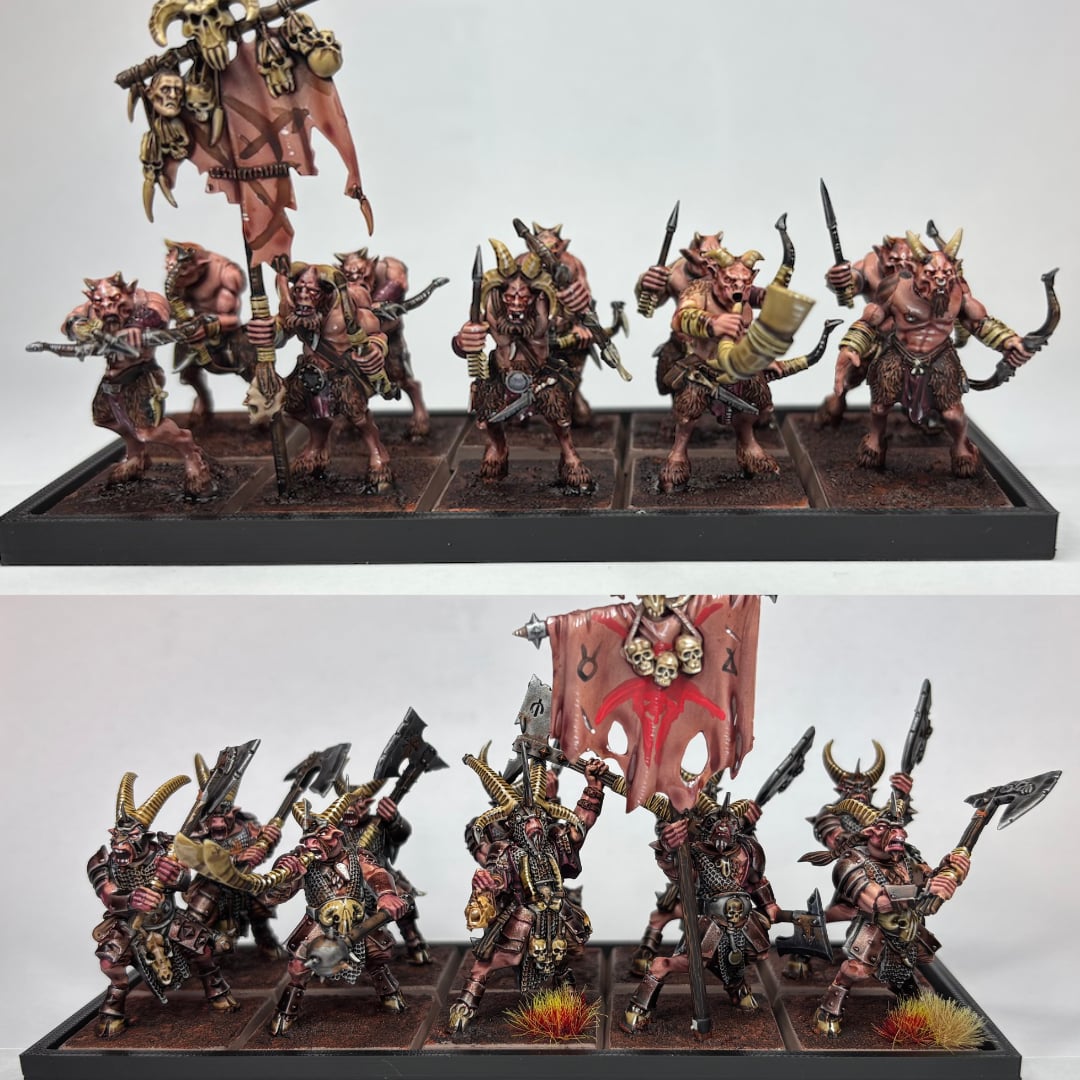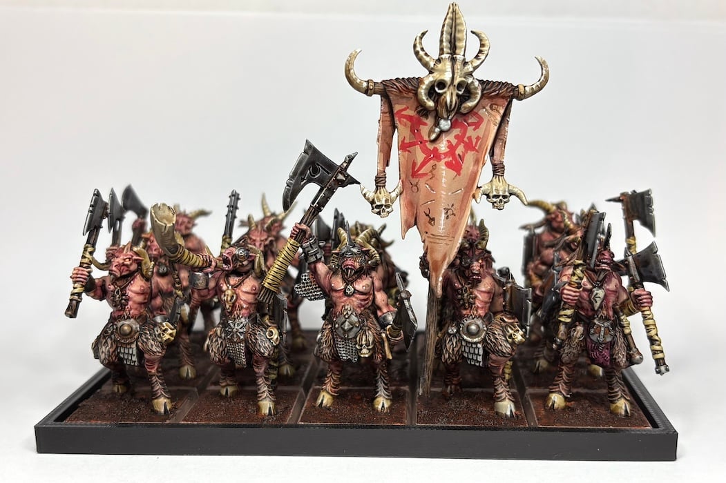 A warm, earthy speedpaint-heavy recipe for Beastmen — reddish skin, natural fur and horns, and weathered metals, finished off with fanatic highlights and a bit of AK fluo for the eyes.